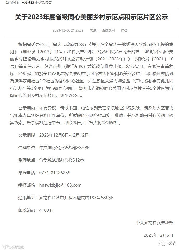 近日,中共湖南省委统战部发布《关于2023年度省级同心美丽乡村示范点和示范片区公示》, 拟授予资阳区张家塞乡合兴村为省级同心美丽乡村。