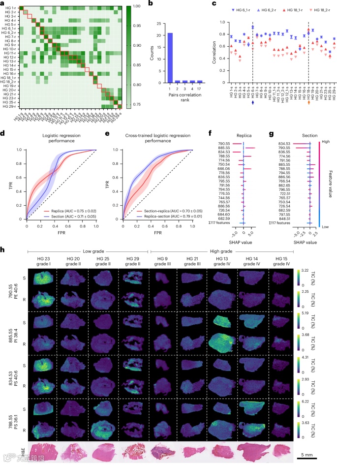 论文的图 5 重点展示了机器学习模型在基于分子复制品和组织切片数据进行人类胶质瘤分级预测的性能。通过比较不同分类模型的结果,以及对模型特征重要性和分子复制品与组织切片之间交叉预测能力的分析,证实了分子复制品在疾病状态分类中的准确性和可靠性,与直接组织分析性能相当。