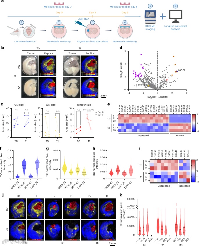 为了更直观地展示整个工作流程,上图(原文Figure1) 详细描绘了从收集小鼠大脑和人类胶质瘤活检样本开始,利用纳米针印迹生成分子复制品,再对分子复制品进行 DESI-MSI 分析,以及通过重复采样研究组织代谢特征随时间的演变等步骤,让我们清晰地看到了该技术的完整操作流程和应用场景。