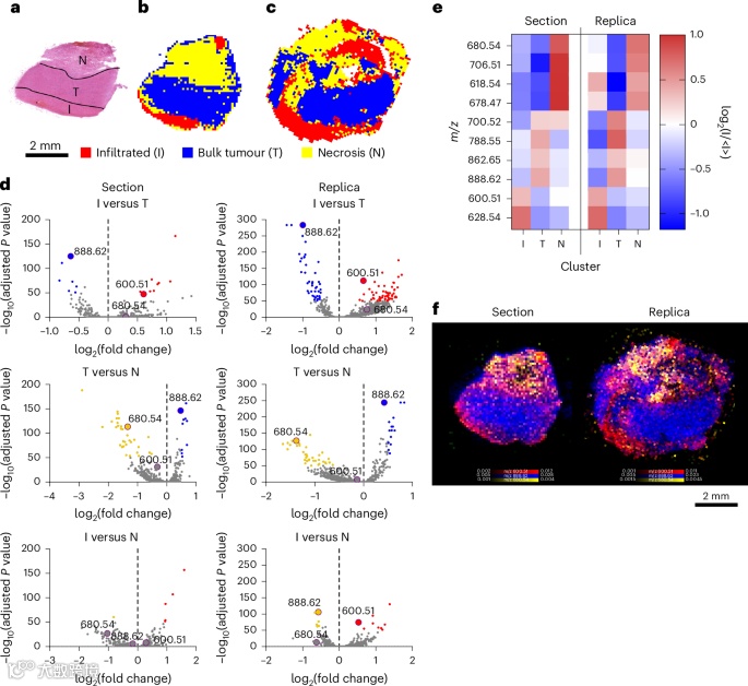 论文的Figure 4以人类胶质瘤活检样本为例,进一步验证了该技术在捕获分子异质性方面的应用潜力。通过对健康脑组织受肿瘤侵袭区域、肿瘤主体区域和坏死区域的区分和脂质组成分析,展示了分子复制品能够为复杂病理组织的分子特征分析提供可靠数据。