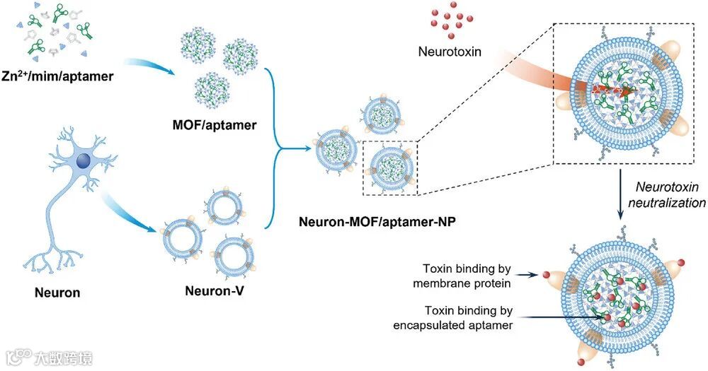 通过将适配体(aptamer)封装于金属有机框架(MOF)核心,并包裹神经元细胞膜,实现了“双重中和机制”。一方面,神经元细胞膜通过膜蛋白模拟宿主细胞的天然毒素结合能力;另一方面,MOF核心内的适配体提供高特异性毒素结合功能。这种协同作用显著提升了神经毒素(如STX和TTX)的中和效率,克服了传统单一机制(仅依赖膜或蛋白质)的局限性。