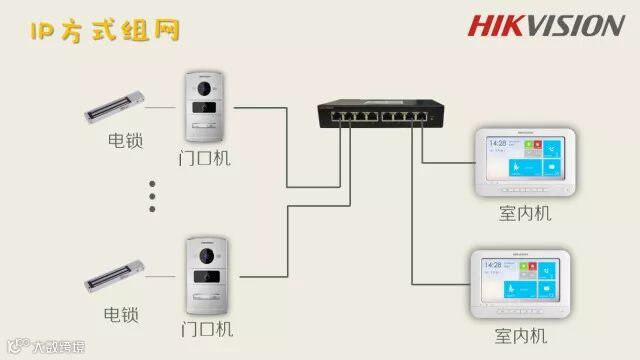 可以看到设备之间只需要通过网线连接至现有局域网内即可,无需复杂走线,IP对讲系统不存在信号传输距离问题,全双工对讲,系统支持标准网络协议,易维护和扩展。