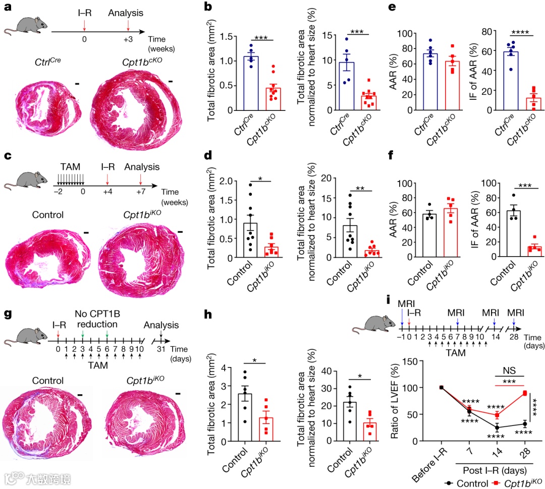 在I-R损伤后24小时,Cpt1bcKO和Cpt1bcKO心脏AAR梗死区域减少,在I-R损伤后48小时,Cpt1bcKO小鼠心脏收缩效果更好,这表明抑制FAO也可以保护I-R损伤。组织学分析显示,与对照组相比,Cpt1bcKO动物的纤维化疤痕区域明显减少,I-R手术后4周心脏功能的主要恢复,达到了几乎与损伤前相同的水平,这明确表明Cpt1b失活促进了心脏再生。