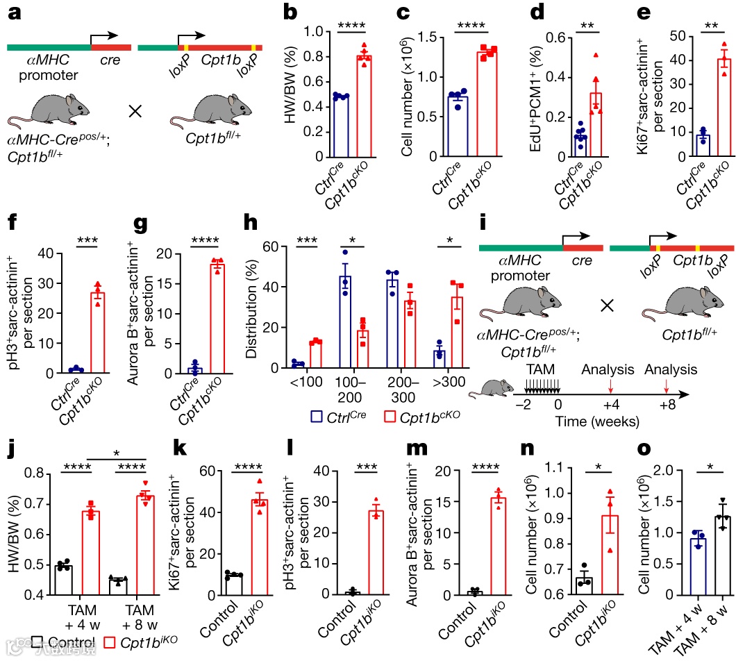 与对照小鼠相比,Cpt1bcKO小鼠的体重(BW)、心脏重量(HW)、HW/BW比值和心脏形态未发生变化。然而,由于心肌同心生长,10周龄Cpt1bcKO小鼠的心脏大小、HW和HW/BW增加。值得注意的是, Cpt1bcKO小鼠心脏中CMs的绝对数量增加一倍。此外, Cpt1bcKO小鼠的CM表面积有相对匀速的增加,这表明心肌同时发生增生性和肥厚性生长。形态学评价显示, CM群体显著增加,表明Cpt1b失活后会形成新的CMs。中等大小CM的比例下降,而较大CM的数量显著增加,反映了CM表面积的总体增加。