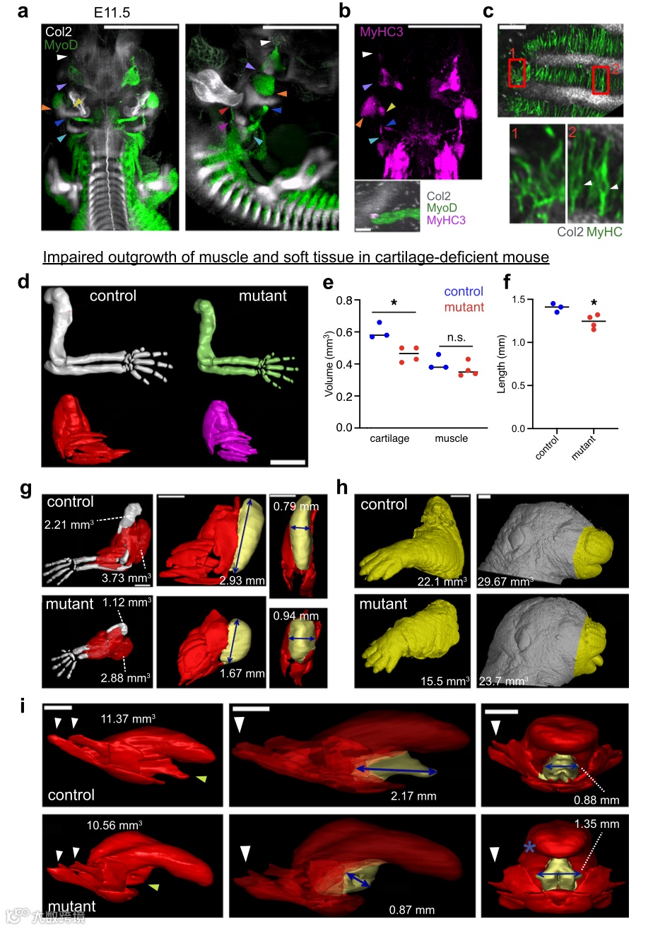 作者用HCR观察小鼠胚胎肌肉和软骨的形成。与鱼的面部发育类似,小鼠成肌细胞(MyoD+)和软骨细胞(Col2a1+)几乎同时出现,肌群的末端与软骨接触(图3a)。这些接触点上的MyoD+细胞表达MyHC,这是一种终端分化标志物,表明这些细胞的分化状态更高级(图3b)。此外,在肋间区,MyHC+细胞的排列与其相对于软骨的位置相关,即肌肉细胞在肋间软骨的条纹之间排列,而在软骨尚未发育的腹侧区域,肌肉细胞排列不规则(图3c)。此外,肌肉和软骨产生了相互连接模式,并在胚胎后期表现出相关的生长模式(图3d-g)。这些结果表明,软骨在小鼠肌肉发育的早期阶段就在肌纤维排列中起作用。除肢体外,面部正面的生长也明显受到抑制(图3h)。附着在Meckel软骨上的肌肉表现出非常严重的发育缺陷(图3i)。综上所述,这些实验揭示了软骨发育对小鼠和斑马鱼骨骼肌生长各向异性的影响。