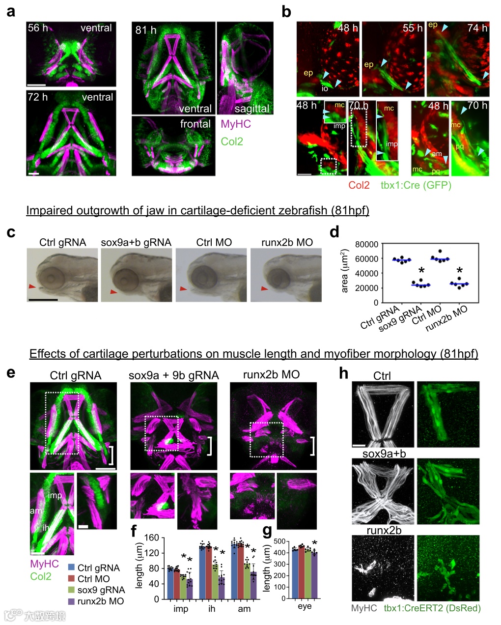 为了揭示与骨骼发育相关的肌细胞融合和定向启动的时间,作者使用斑马鱼胚胎作为模型系统。在45-89hpf(受精后小时)之间,斑马鱼面部区域出现软骨和肌肉,大多数腹侧肌肉-骨骼元素在50-60hpf之间变得明显(图1a左上)。到72hpf时,II型胶原阳性的软骨和肌球蛋白重链阳性的面部肌肉已经建立了成熟的相互连接模式(图1a左下),随着幼鱼的继续生长(图1a右),这种模式得到巩固。在48-50 hpf,面部同时出现软骨细胞和肌肉细胞簇(图1b)。单个肌细胞附着在聚结的软骨细胞簇上,并随着软骨元件大致形成最终形状而生长(图1b)。因此,颅肌的起始和进一步发育与第一个软骨和相应附着点的出现是同步的。