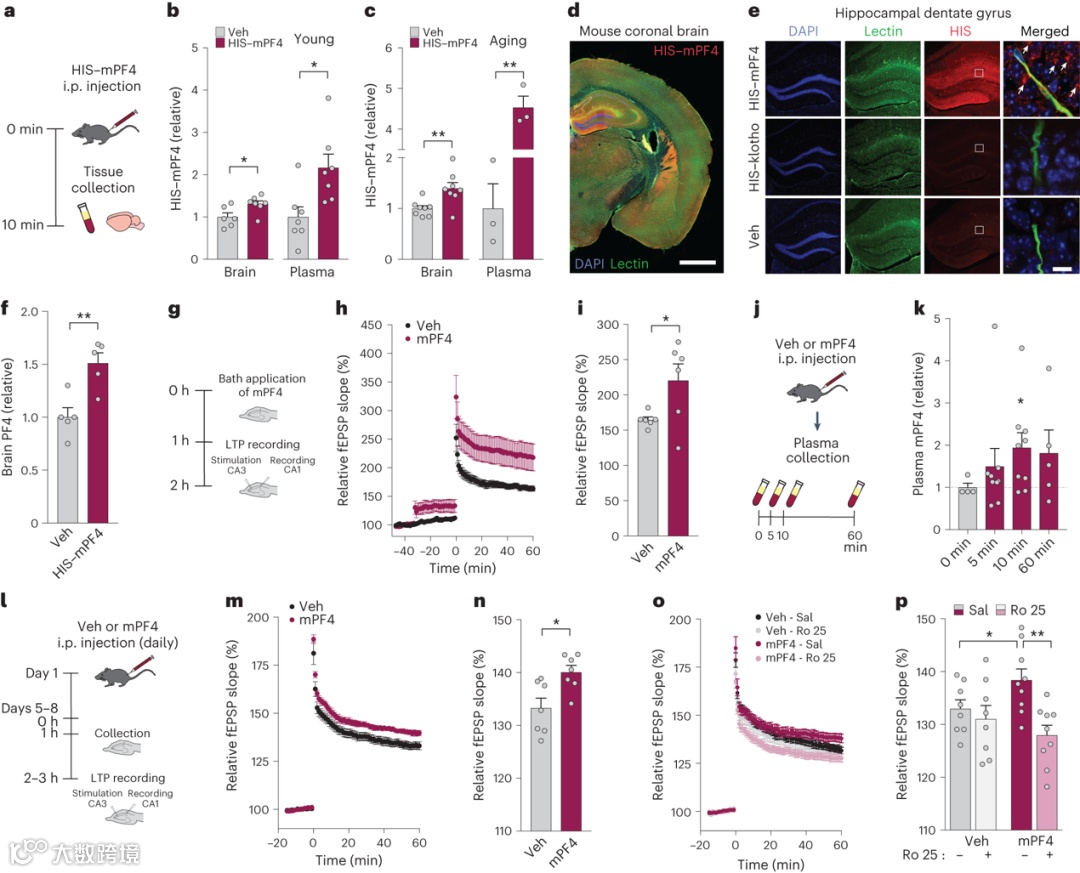 在年轻和衰老的小鼠中,注射HIS-mPF4的小鼠显示出大脑中HIS水平增加,血浆中HIS水平大幅增加。这些数据表明PF4可能通过一种高度敏感的检测系统进入大脑。使用全脑成像,作者发现HIS-mPF4确实在大脑中被检测到。在外周注射HIS-mPF4的小鼠中,海马齿状回的荧光信号特别明显,这是一个对空间记忆至关重要的区域。最后,作者将mPF4外周注射到小鼠体内,然后使用PF4酶联免疫吸附试验(ELISA)直接测定脑内PF4水平。与对照相比,脑内PF4水平增加1.5倍。