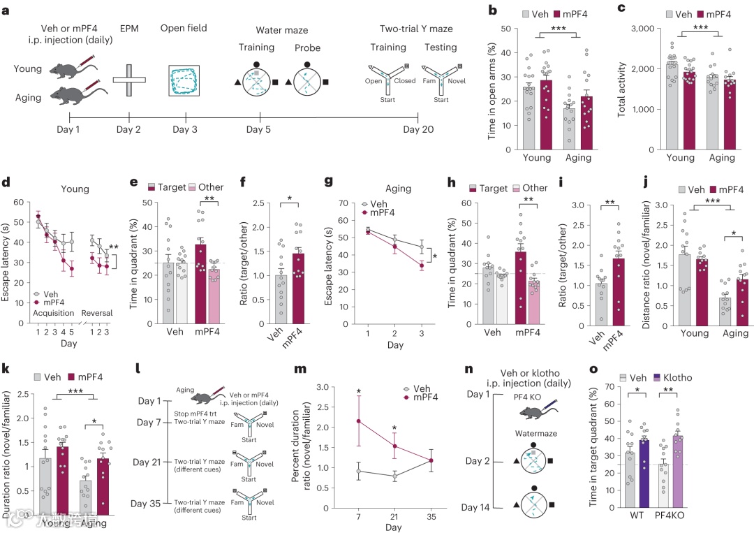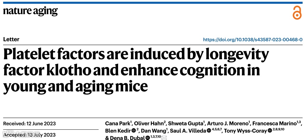 为了探究长寿因子的机制,美国加州大学旧金山分校Dena B. Dubal团队在Nature Aging(IF=16.6)上发表题为Platelet factors are induced by longevity factor klotho and enhance cognition in young and aging mice的研究性论文。作者发现在老年小鼠中,PF4降低认知障碍,并恢复海马中与认知能力相关的选择因子的增加。在缺乏PF4的小鼠中,klotho对认知能力的影响仍然存在,这表明这种血小板因子足以增强认知能力,但不是klotho作用所必需的。klotho信使的血小板因子可以增强年轻大脑的认知能力,并减少大脑的认知缺陷。