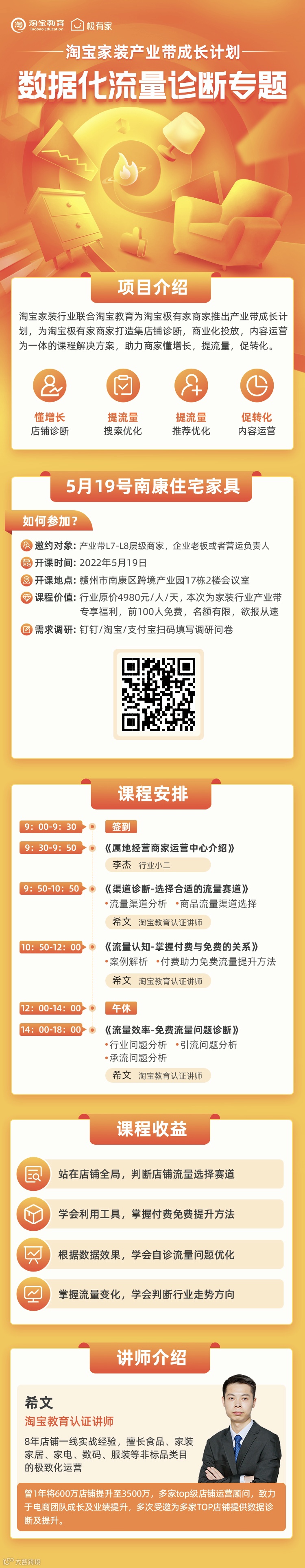 本次培训课将根据不同区域的产业优势及店铺特征,为淘宝极有家商家打造集店铺诊断、商业化投放、内容运营为一体的课程解决方案,让各商家在家门口就能学到产业特色电商课,助力商家懂增长、提流量、促转化。