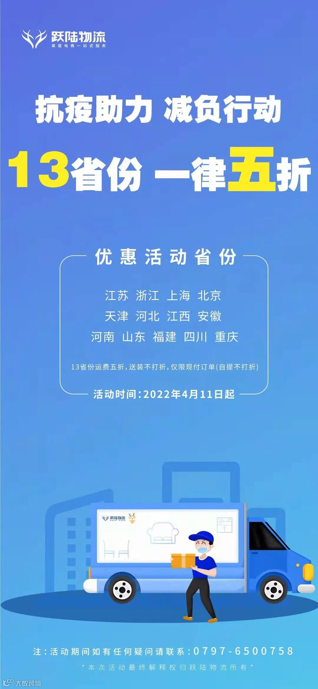 为应对难关,帮助家具企业、电商企业降本增效,跃陆物流将对全国13个省份进行价格调整,推出5折优惠活动。