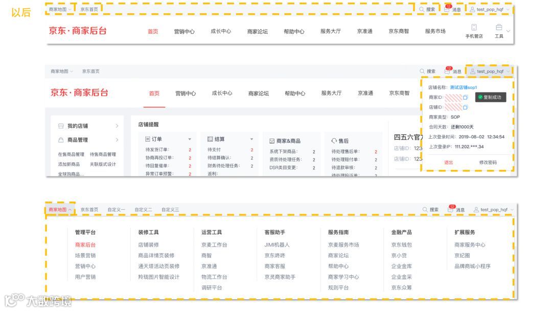 京东商家后台首页对找菜单、配置常用菜单、菜单搜索等做了优化。