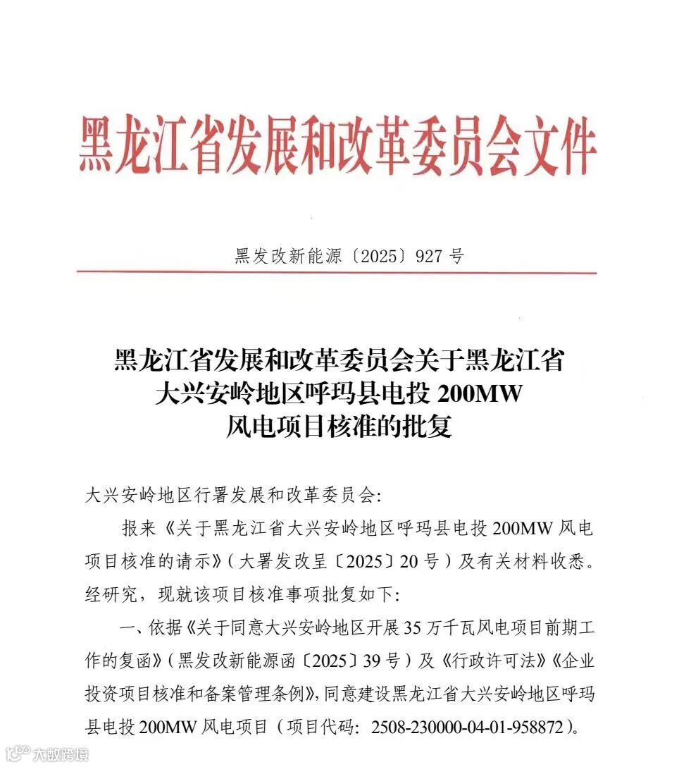 2025年10月29日,天津电力公司传来重磅喜讯,呼玛二期200MW风电项目成功取得核准批复,标志着天津电力公司“党旗领航百日攻坚 决战决胜年度目标”项目发展攻坚战首战告捷。