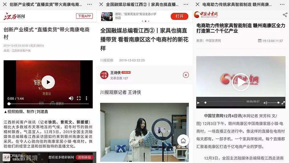 12月3日,“作示范、勇争先——2019全国主流融媒体总编辑看江西”采风团走进南康家居小镇电商村,包括新华网、中国日报网、中国新闻网、央广网、江西新闻、川报观察等全国60多家主流融媒体的总编记者齐聚园区,深入考察调研。