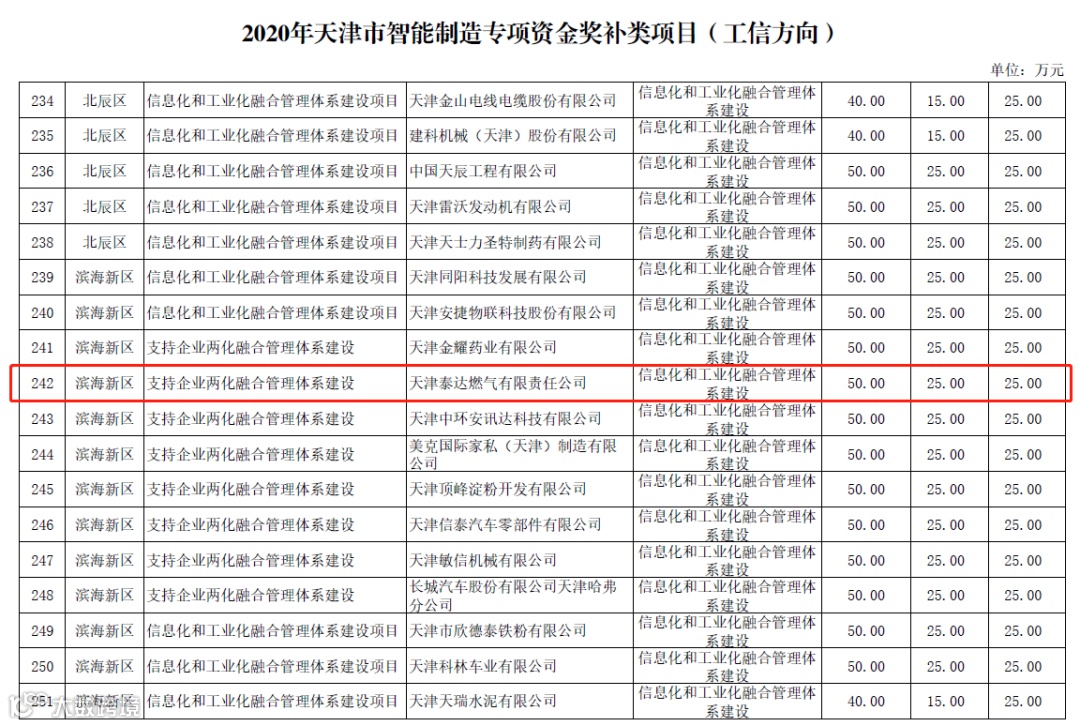 近日,天津市工业和信息化局公布“2020年天津市智能制造专项资金项目”名单,泰达控股所属天津泰达燃气有限责任公司(以下简称“泰达燃气”)“支持企业两化融合管理体系建设”项目和“天津泰达智慧燃气生产调度大数据平台建设”项目榜上有名,泰达燃气在“两化融合”和“智能制造”方面实现新突破。