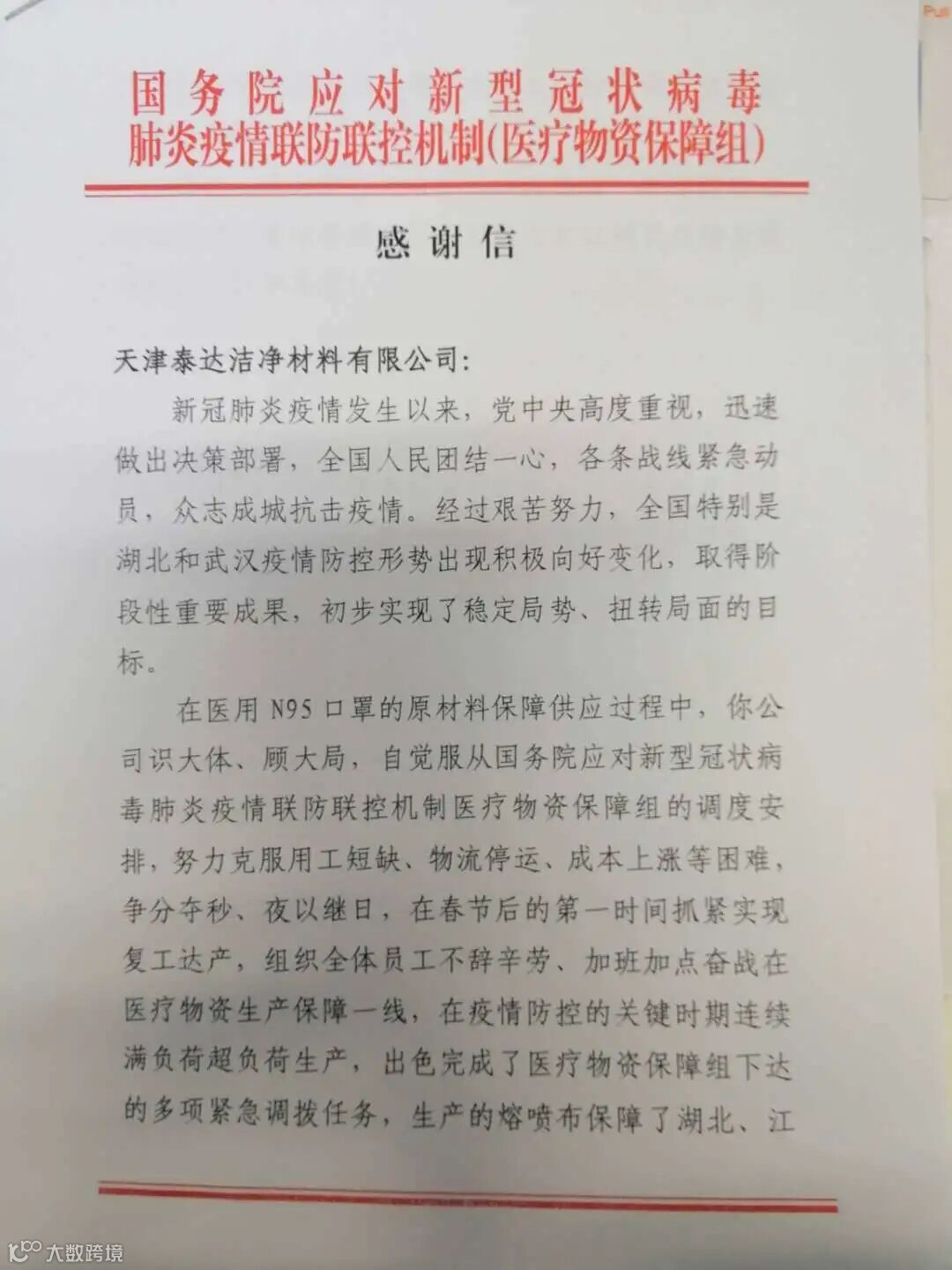 作为国家疫情防控重点保障企业,1月21日以来,公司所属泰达洁净全体干部职工跨年无休,满负荷生产,24小时开足马力,截止5月3日,泰达洁净累计生产口罩滤材破千吨,已达1005.35吨,可供生产平面口罩7.85亿只、N95口罩7715万只;累计供货1017.31吨;N95发改委名录企业调拨121.6吨;利用口罩生产线,累计为全市提供169.8万只口罩;利用生产口罩滤材的资源优势,为全市换回医用平面口罩601.65万只,为天津市和全国的疫情防控攻坚战贡献了力量。国家发改委、中央指导组、国务院应对新型冠状病毒肺炎疫情联防联控机制医疗物资保障组也先后对泰达洁净表示赞誉和感谢。五一节前,天津市委副书记、市长张国清,市委常委、组织部部长喻云林、市政府秘书长孟庆松一行专程到泰达洁净慰问一线工作人员和在疫情防控期间作出突出贡献的党员干部。公司所属泰达环保双港和贯庄两家垃圾焚烧发电厂还承担着包含海河医院在内的天津市25家发热门诊生活垃圾的无害化处理工作,截止5月3日,累计处理医疗单位生活垃圾3176.44吨,极大缓解了医院在疫情期间的垃圾处理压力,间接支援了抗“疫”斗争。
