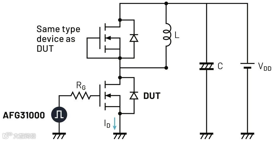 所使用的仪器包括:用于提供电压的电源或SMU、用于输出脉冲以触发MOSFET栅极使其打开从而开始导通电流的任意函数发生器 (AFG),以及用于测量由此产生的波形的示波器。