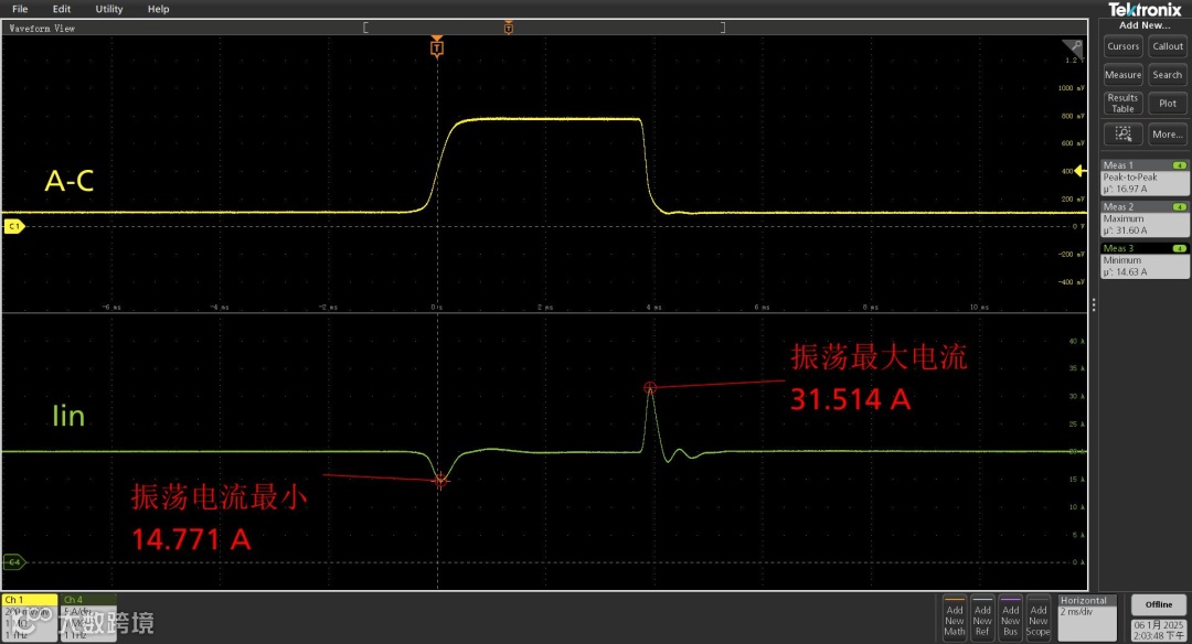 在测试中我们并未选用传统的电源产品来作为电流输出,这是因为传统的电源的CC(恒流)模式是属于被动模式,比如我要产生一个20A的恒流输出,就需要设置限制电流为20A,输出电压就不能随便设置了,需要根据被测物的负载来进行计算,比如DUT的阻值为1Ω,那就意味边界电压为20A*1Ω=20V,如果想要电源处于恒压模式,则只需设置电压大于20V,如果想要电源处于恒流模式,那么就需要设置电压小于20V,但是在理想二极管的测试中,由于二极管的工作状态的切换会导致内阻的极大变化,这就会导致电源内部响应判断不及时,从而会出现内阻切换时的输出电流不稳定,如下图所示: