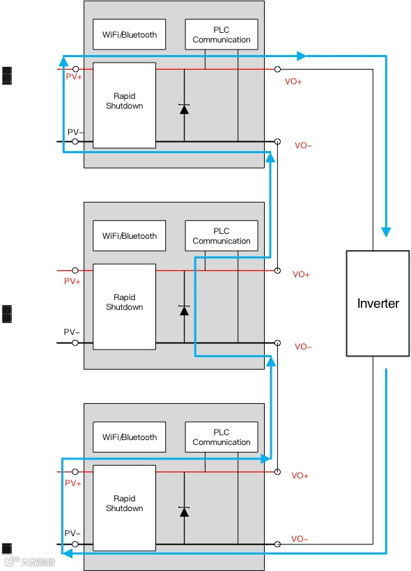 在快速关断器以及优化器中,都需要一个旁路二极管进行电流旁路,如下图所示,PV电池板实际上通过快速关断器/优化器的输出端串联,并最终流经逆变器。当任何一个太阳能电池板发生故障时,则该板串的的电压会崩溃。旁路二极管为受损的太阳能电池板串提供一条并联的电流路径。