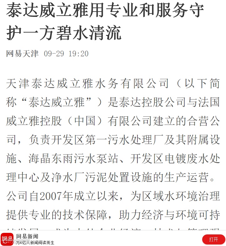 天津泰达威立雅水务有限公司(以下简称“泰达威立雅”)是泰达控股公司与法国威立雅控股(中国)有限公司建立的合营公司,负责开发区第一污水处理厂及其附属设施、海晶东雨污水泵站、开发区电镀废水处理中心及净水厂污泥处置设施的生产运营。公司自2007年成立以来,为区域水环境治理提供专业的技术保障,助力经济与环境可持续发展,成为中外企业经济、技术与管理强强联合的典范。