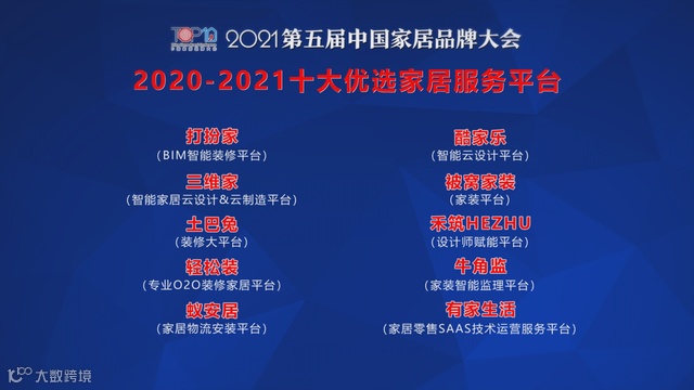 “洗礼之后,谁主沉浮?”2021年7月19日,2021第五届中国家居品牌大会在广州举行,公开发布36个“2020-2021中国家居十大优选品牌”榜单,其中打扮家、酷家乐、三维家、被窝家装、土巴兔、禾筑HEZHU、轻松装、牛角监、蚁安居、有家生活上榜“2020-2021十大优选家居服务平台”,成为这个年度里家居服务平台领域良性发展和持续创新的代表性品牌矩阵。