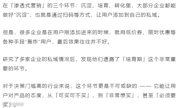 渗透式营销,指的是企业通过用户心智制定有节奏的运营策略,以内容为核心对私域用户进行服务。它包括沉淀期、培育期、转化期三个阶段,每阶段都是步步推进、层层深入,以达到提高成交率的目的。