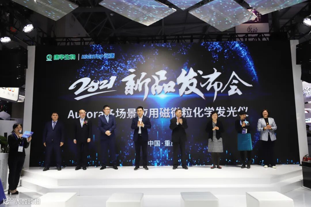 伴随着激动人心的旋律,在公司高层与专家们的见证下,Aurora系列磁微粒化学发光仪揭开了神秘的面纱,现场观众一片赞叹,Aurora 2000i/1000i/500i设计精妙,配套近50种特色产品,具有更多应用场景。台下观众纷纷驻足,一同见证这一新的历史时刻。随后,康华生物市场部李乾楠博士对Aurora多场景应用磁微粒化学发光仪进行了精彩讲解,如独家磁微粒化学发光产品VEGF、火爆的“IP组合”(PCT、IL-6)均可在此平台实现。
