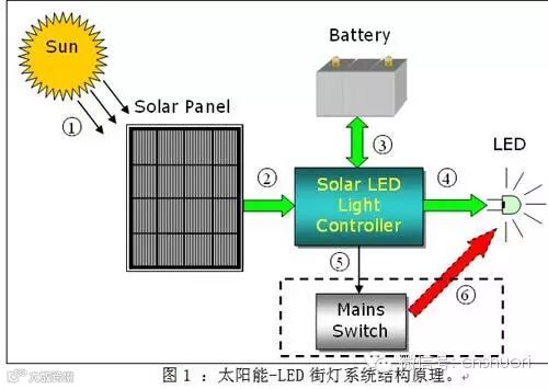 太阳能电池板在太阳光的照射下,其内部PN结会形成新的电子空穴对,在一个回路里就能产生直流电流;这个电流流入控制器,会以某种方式给蓄电池充电。蓄电池在白天的时候会接受充电,而在晚上则会提供能量给LED。LED的工作是通过控制器进行的,控制器在保证LED恒流工作的同时,也会监测LED的状态以及控制工作时间长短。连续阴雨天以及蓄电池电能不足的情况下,控制器会发出控制信号来启动外部的市电供电系统(不包含在控制器中),保证LED的正常工作。外部的市电供电系统只是作为后备能源,只有在蓄电池电能不足的情况下才会被使用。蓄电池的充电完全只是通过太阳能来实现的,以确保最大限度使用太阳能。