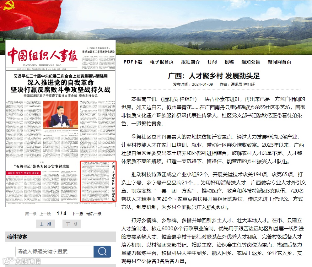 朵努社区是南丹县最大的易地扶贫搬迁安置点,通过大力发展非遗民俗产业,让乡村技能人才在家门口培训、就业,带动社区群众增收致富。2023年以来,广西壮族自治区党委突出本土培养和外部引进相结合,破解农村人才总量不足、人才整体素质不高的瓶颈,打造一支沉得下、留得住、能管用的乡村振兴人才队伍。