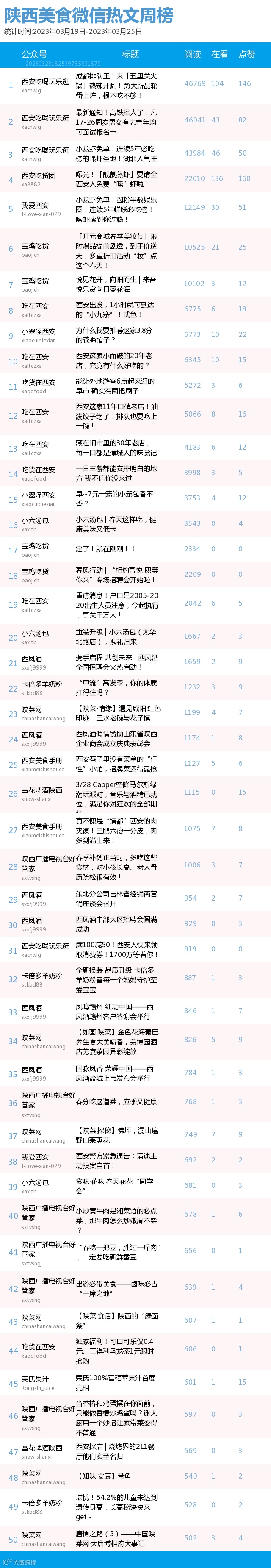 最新陕西美食类微信公众号50强重磅出炉!TOP50上周共计发文143篇,阅读总量达到25万+,在看总量达到530。阅读总量较上周有所下降,希望下期各大平台再接再厉!(查看榜单可直接下滑)