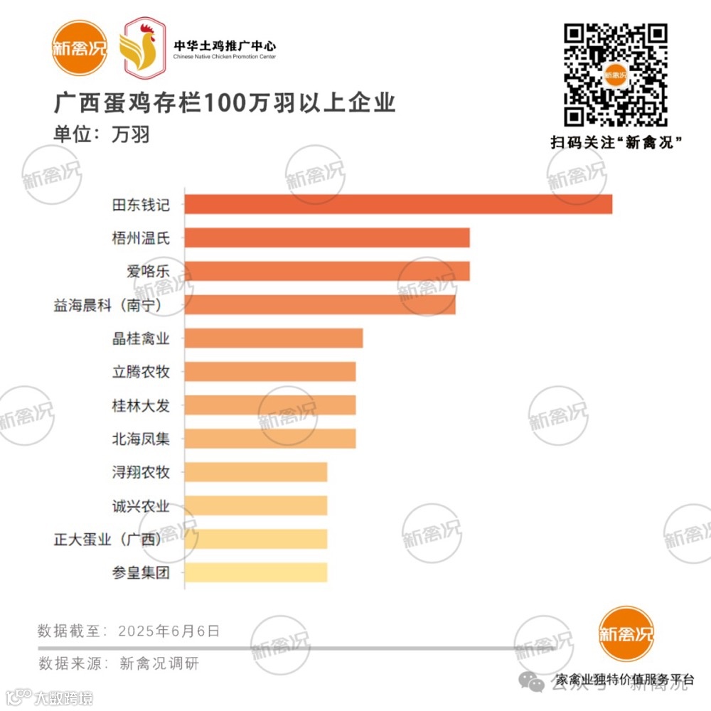 截至2024年底,广西蛋鸡存栏达2300万羽,涨幅53.33%,12家存栏超100万羽的企业占全区总量72.39%。其中田东钱记(350万羽)、梧州温氏(200万羽)、爱咯乐(200万羽)居前三,晶桂禽业等9家在100万至190万羽。广西蛋鸡产业正从散养为主转向集团和地方龙头引领、中等规模蛋企主导,规模化和集约化程度将进一步提升。
