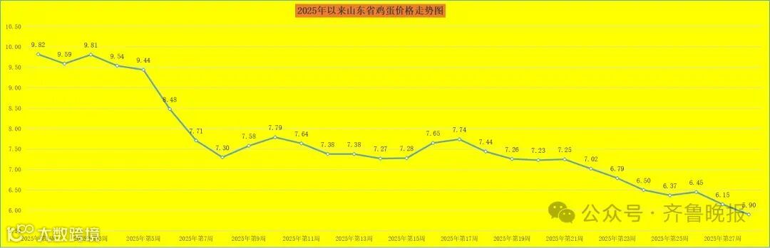 山东省畜牧总站最新统计数据显示,上周山东省鸡蛋均价跌至5.90元/公斤,同比降38.22%,为2021年以来最低值。其中曹县最低价仅5.40元/公斤,而养殖成本约7.0元/公斤,行业普遍亏损。主因是二季度新开产蛋鸡激增、高温天气影响和学校放假致需求疲软,叠加猪肉低价分流消费。