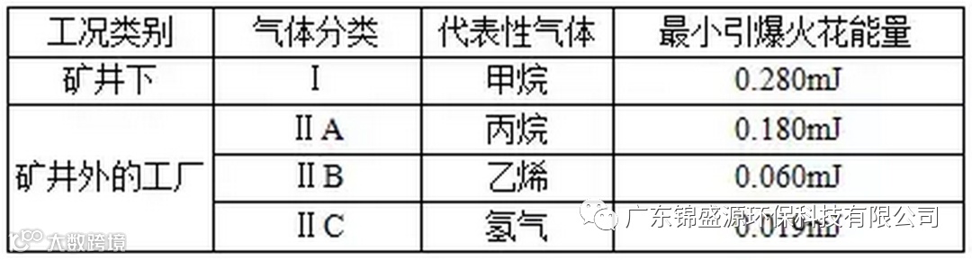 根据可能引爆的最小火花能量,我国和欧洲及世界上大部分国家和地区将爆炸性气体分为四个危险等级, 如下表 :