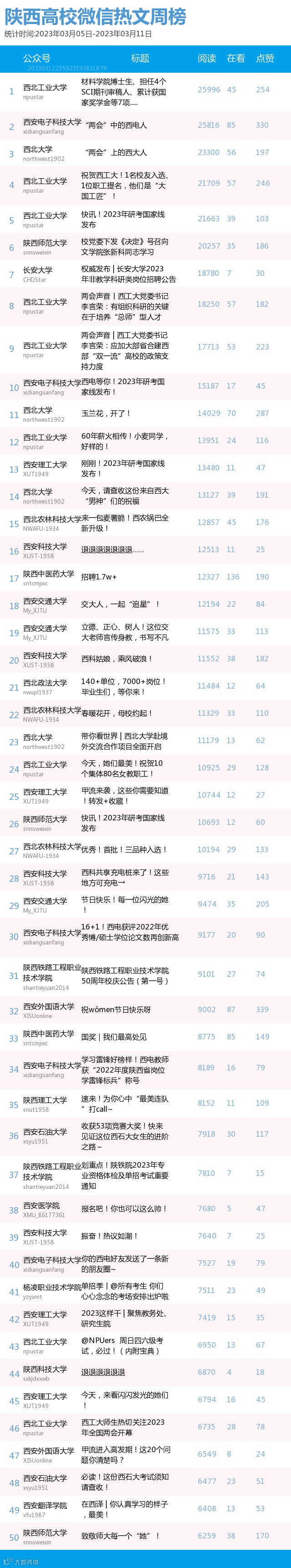 最新陕西高校微信公众号50强重磅出炉!TOP50上周共计发345篇,贡献阅读总量113W+,在看总量3588,阅读数据较上周有所上升,希望各大平台下期继续加油哦~(查看榜单可直接下滑)