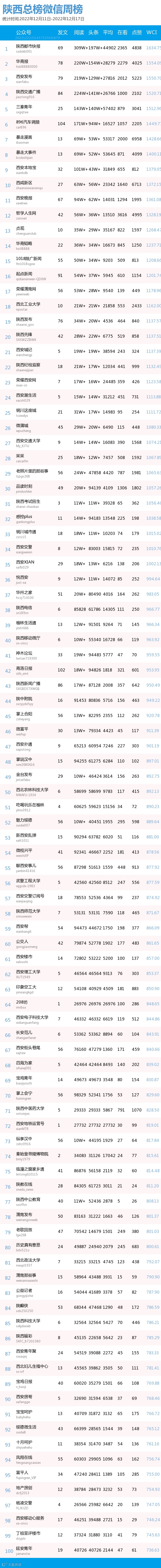最新陕西总榜微信公众号100强重磅出炉!TOP100上周共计发2946篇,贡献阅读总量2808W+,在看总量3W+,阅读数据较上周有所下降,希望各大平台下期继续加油哦~(查看榜单可直接下滑)