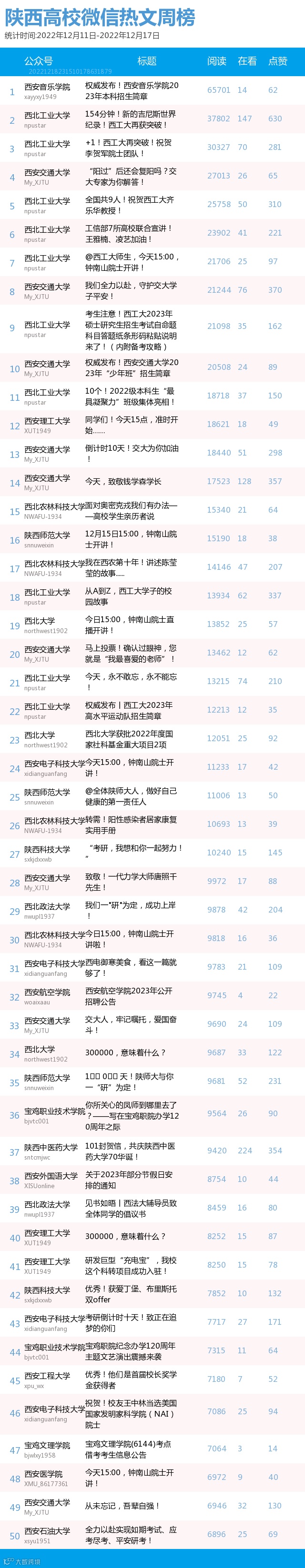 最新陕西高校微信公众号50强重磅出炉!TOP50上周共计发324篇,贡献阅读总量129W+,在看总量4651,阅读数据较上周有所上升,希望各大平台下期继续加油哦~(查看榜单可直接下滑)