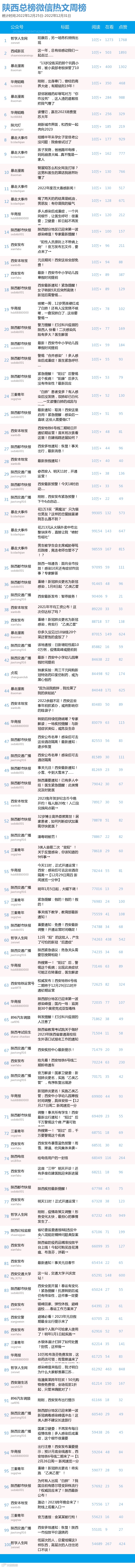 最新陕西总榜微信公众号100强重磅出炉!TOP100上周共计发2683篇,贡献阅读总量316W+,在看总量3W+,阅读数据较上周有所下降,希望各大平台下期继续加油哦~(查看榜单可直接下滑)