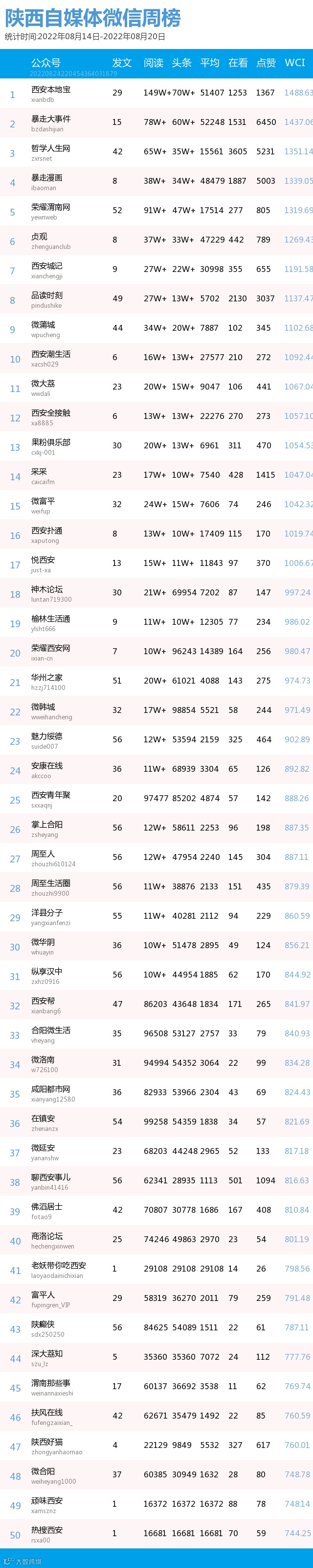 最新陕西自媒体微信公众号50强重磅出炉!TOP50上周共计发文1495篇,贡献阅读总量980万+,在看总量1万+,阅读总量较上周有所上升,希望下期各大平台加油哟~(查看榜单可直接下滑)
