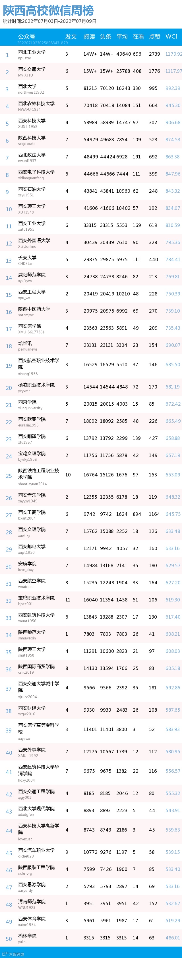 最新陕西高校微信公众号50强重磅出炉!TOP50上周共计发241篇,贡献阅读总量131+,在看总量4690,阅读数据较上周有所下降,希望各大平台下期继续加油哦~(查看榜单可直接下滑)