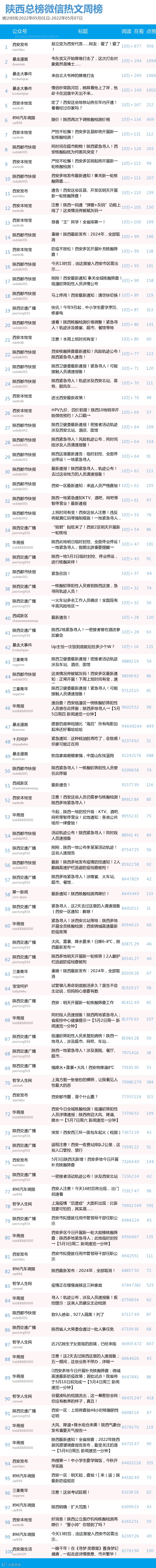 最新陕西总榜微信公众号100强重磅出炉!TOP100上周共计发文2849篇,贡献阅读总量2437万+,在看总量3万+,阅读总量较上周有所下降,希望下期各大平台加油哟~(查看榜单可直接下滑)