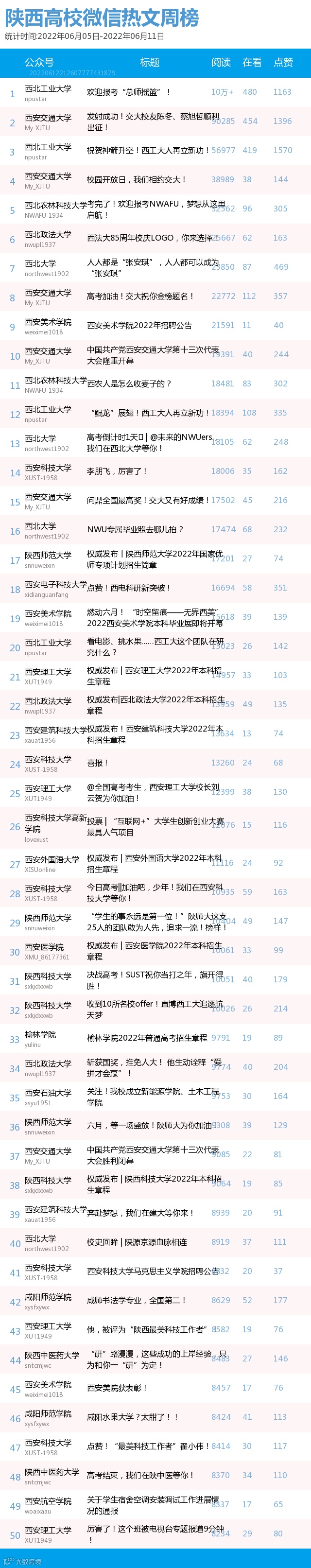 最新陕西高校微信公众号50强重磅出炉!TOP50上周共计发277篇,贡献阅读总量145+,在看总量5741,阅读数据较上周有所上升,希望各大平台下期继续加油哦~(查看榜单可直接下滑)