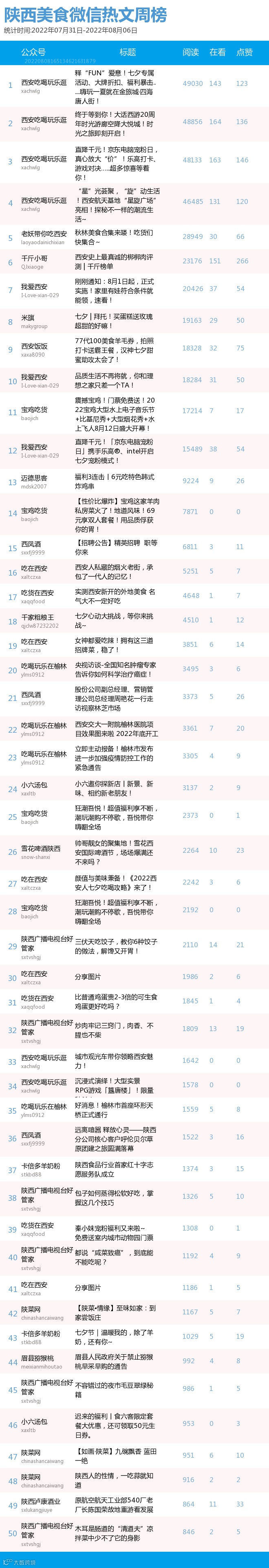 最新陕西美食类微信公众号50强重磅出炉!TOP50上周共计发文218篇,阅读总量达到46万+,在看总量达到1142。阅读总量较上周有所上升,希望下期各大平台再接再厉!(查看榜单可直接下滑)