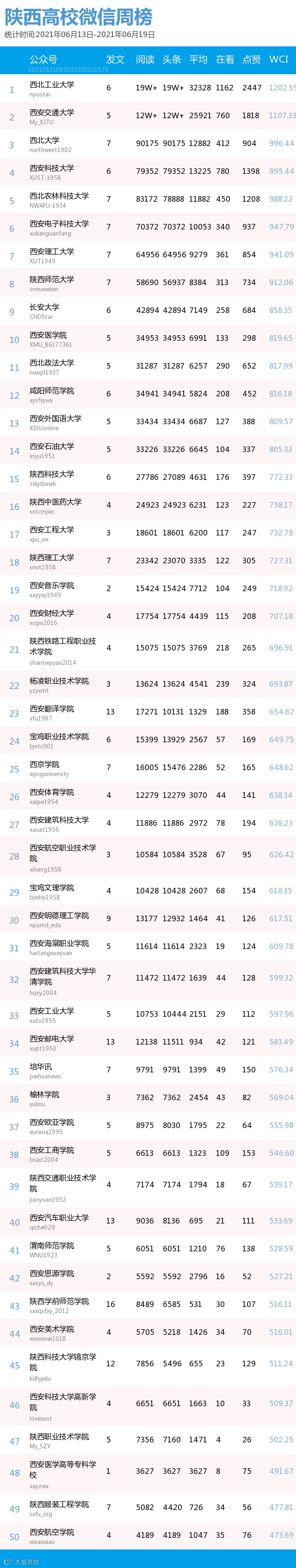 最新陕西高校微信公众号50强重磅出炉!TOP50上周共计发294篇,贡献阅读总量138万+,在看总量8173,阅读数据较上周有所下降,希望各大平台下期继续加油哦~(查看榜单可直接下滑)
