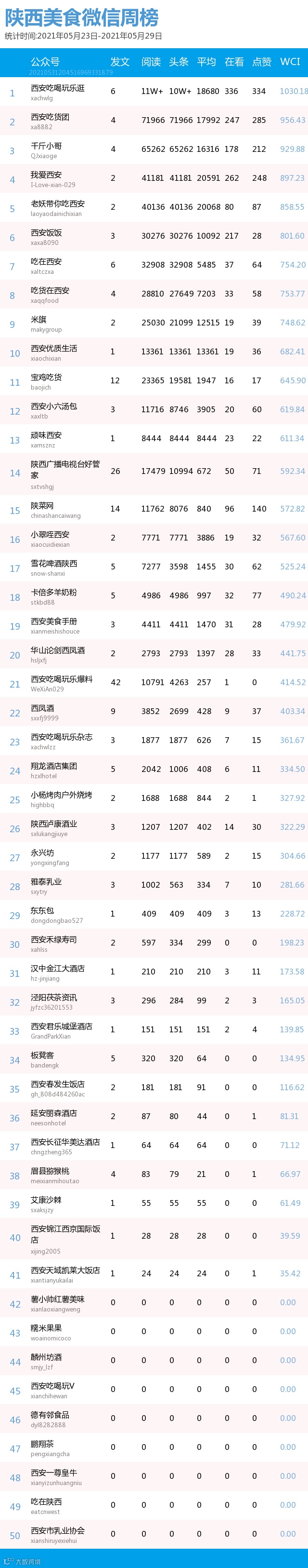 最新陕西美食类微信公众号50强重磅出炉!TOP50上周共计发文201篇,阅读总量达到58万+,在看总量达到1831。阅读总量较上周有所下降,希望下期各大平台再接再厉!(查看榜单可直接下滑)