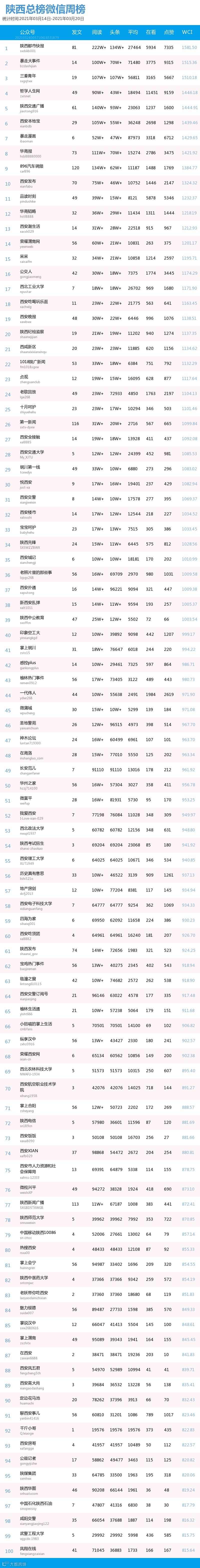 最新陕西微信公众号总榜周榜100强重磅出炉!TOP100上周共计发文2862篇,阅读总量达2349万+,在看总量7万+。各项数据相比上期有所上升,希望下期各大平台再接再厉!(查看榜单可直接下滑)