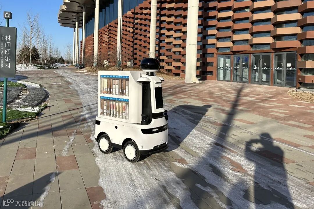 而在图书馆户外绿心公园起步区,室外文献流通机器人迎面缓缓驶来,读者不用进入场馆,在室外就可以通过小机器人借还图书。无论是阳光明媚还是细雨绵绵,它都以四轮四驱底盘灵活转向,在自然风光中自如穿梭,提供自助服务:招手即停、有问必答、自助借阅……仿佛一位永不厌倦、始终待命的图书管理员。从自主导航到避障越障,从超长续航到自主充电,阿法迪室外文献流通机器人以其卓越性能保证了每次互动都能带给读者惊喜和便捷。