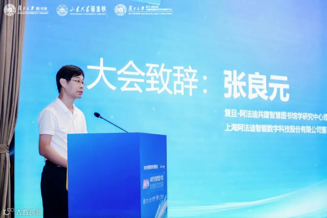 复旦大学图书馆副馆长张计龙对“复旦-阿法迪共建智慧图书馆学研究中心”成立五年来的工作做了回顾总结,分享了复旦大学图书馆在数字化转型道路上的实践创新。