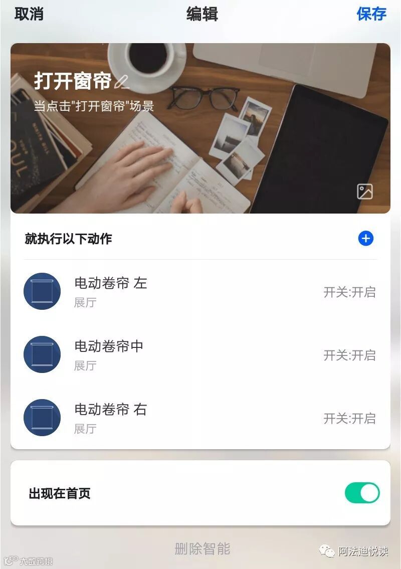 可以编辑场景名称、设置封面、添加动作、选择是否出现在首页。