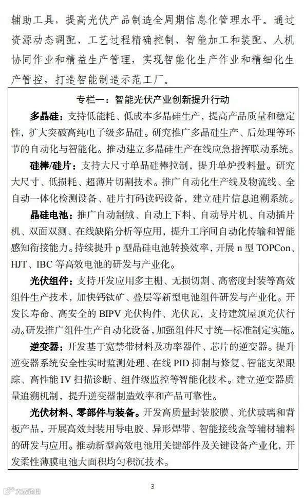 在提升行业发展水平方面,《行动计划》提出,加快产业技术创新。推进智能光伏产业链技术创新,加快大尺寸硅片、高效太阳能电池及组件等研制和突破。夯实配套产业基础,推动智能光伏关键原辅料、设备、零部件等技术升级。开展智能光伏与建筑节能、交通运输、绿色农业等领域相结合的交叉技术研究。