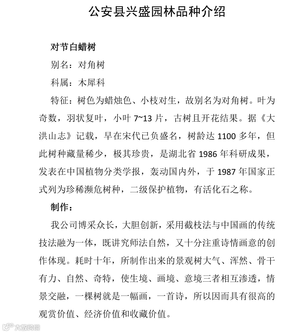 兴盛园林优质稀缺景观树种--对节白蜡特价出售!对节白蜡是珍稀树种,二级保护植物,有活化石之称。此次出售的对节白蜡又是1986年湖北科研成果,采用截枝法与中国画的传统技法融为一体,既讲究师法自然,又注重诗情画意的创作体现。耗时十年,所制作出来的景观树。大气、浑然、骨干有力、自然、奇特,使生境、画境、意境三者相互渗透,情景交融,一棵树就是一幅画,一首诗,所以此批对节白蜡景观树具有很高的观赏价值、经济价值和收藏价值。机会难得,买到就是赚到!