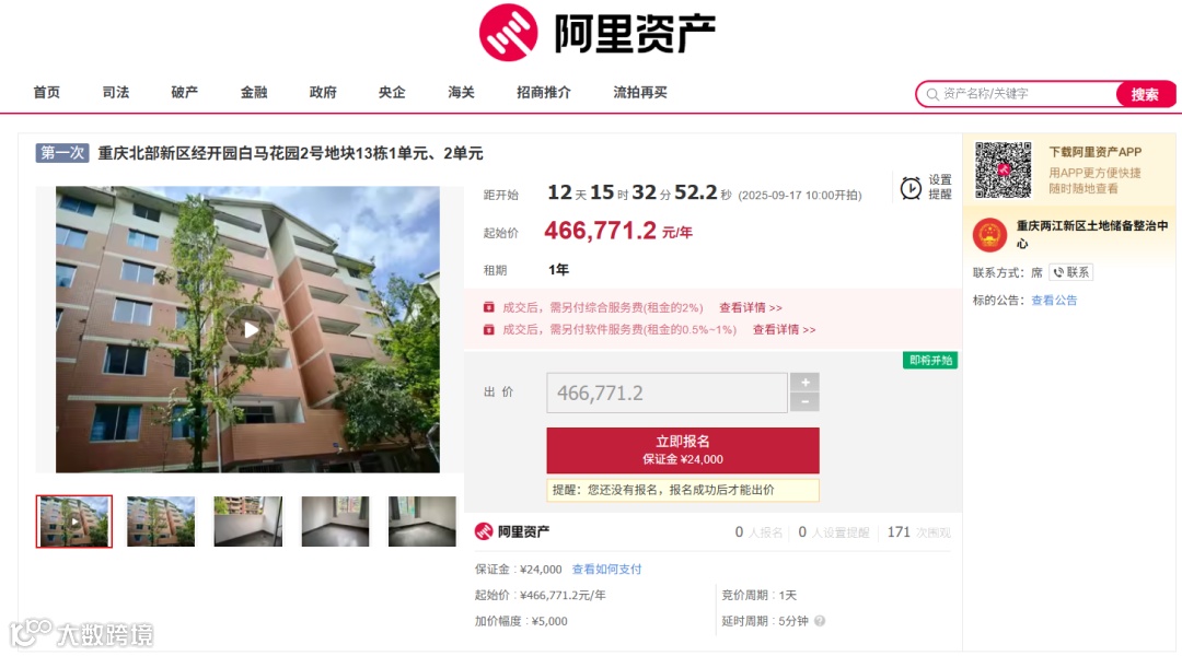 重庆两江新区土地储备整治中心将于2025年9月17日10时起至2025年9月18日10时止(延时除外)在阿里资产平台上对重庆北部新区经开园白马花园2号地块13栋1单元、2单元整栋租赁权进行公开拍卖活动。